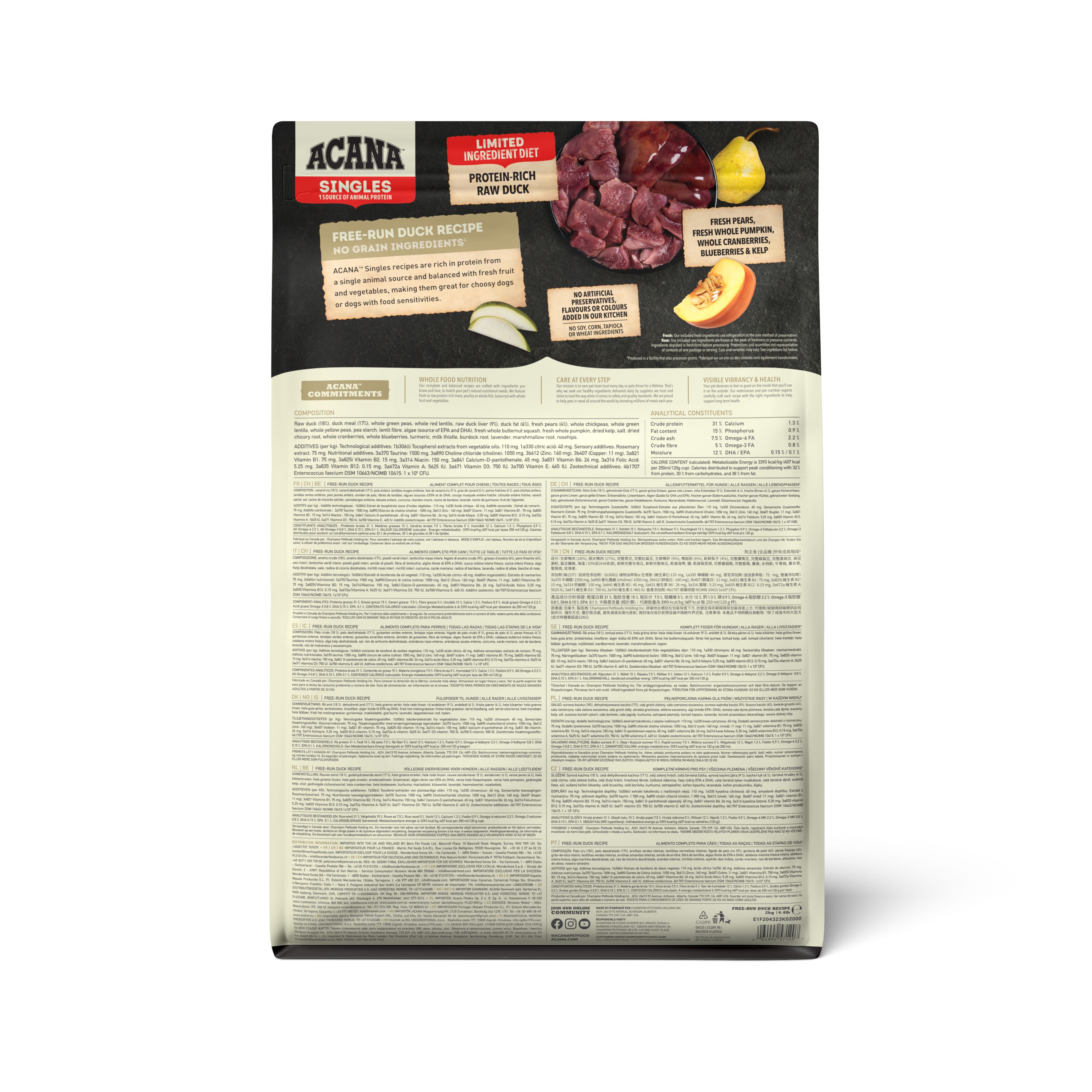 Раціон ACANA Free Run Duck створений відповідно до рівнів поживності встановлених FEDIAF для собак на всіх стадіях житття, за винятком цуценят великих порід в період зростання (32 кг або більше в дорослому віці).