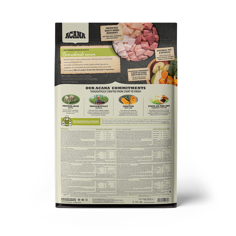 Сухий корм для собак усіх порід на усіх стадіях  життя Acana Grasslands Recipe створений, щоб забезпечити повноцінне та збалансоване харчування з урахуванням природних потреб улюбленців. Раціон Acana Grasslands Recipe на 70% містить високоякісні м’ясні інгредієнти – свіже або сире м’ясо ягняти, качки та яйця, а на 30% – збалансований фруктами, овочами й травами. Така формула забезпечує собаку необхідними білками, жирами та нутрієнтами для підтримки здоров’я, розвитку м’язів і високого рівня енергії.