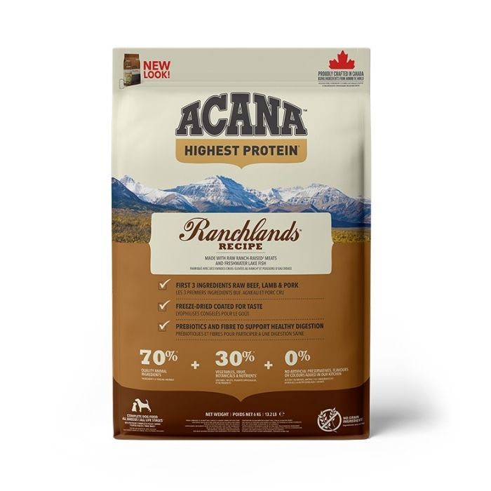 Сухий корм для собак усіх порід на всіх стадіях життя Acana Ranchlands Recipe створений, щоб забезпечити повноцінне та збалансоване харчування з урахуванням природних потреб улюбленців. Раціон Acana Ranchlands Recipe на 70% містить високоякісні м’ясні інгредієнти – м'ясо бичків, вирощених на ранчо, свинина, ягнятина, озерна риба та м'ясо бізона, а на 30% – збалансований фруктами, овочами й травами. Така формула забезпечує собаку необхідними білками, жирами та нутрієнтами для підтримки здоров’я, розвитку м’язів і високого рівня енергії.