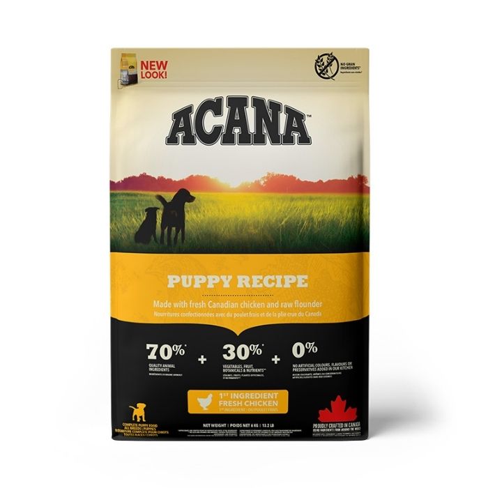 Сухий корм для цуценят усіх порід Acana Puppy Recipe має особливу рецептуру, створену з турботою про здорове зростання маленьких вихованців. Раціон Acana Puppy Recipe на 70% містить якісні м’ясні інгредієнти – м’ясо канадських курчат, індички та сиру камбалу, а на 30% – збалансований фруктами, овочами й травами. Така формула забезпечує цуценя необхідними білками, жирами та нутрієнтами для здорового росту, розвитку м’язів і формування сильного імунітету.