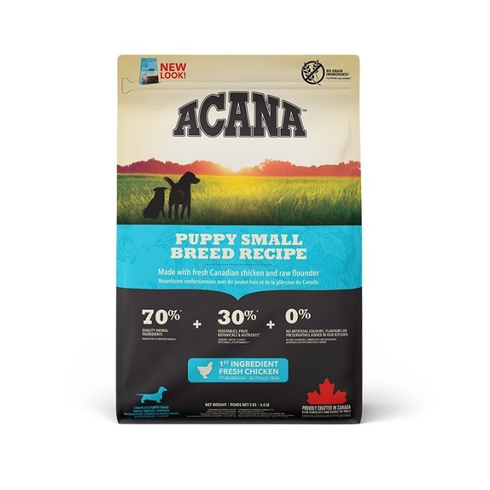 Сухий корм для цуценят малих порід Acana Puppy Small Breed Recipe має особливу рецептуру, створену з турботою про здоровий ріст і розвиток маленьких вихованців. Раціон Acana Puppy Small Breed Recipe на 70% містить високоякісні м’ясні інгредієнти – свіже м’ясо канадських курчат, індички та сиру камбалу, а на 30% – збалансований фруктами, овочами й травами. Така формула забезпечує цуценя всіма необхідними білками, жирами та нутрієнтами для формування сильних м’язів, міцного імунітету та стабільного рівня енергії.
