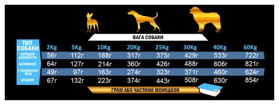 • Використовуйте таблицю з годування, як орієнтовну та коригуйте дозування, враховуючи вік, рівень фізичної активності, вагу та породу собаки.