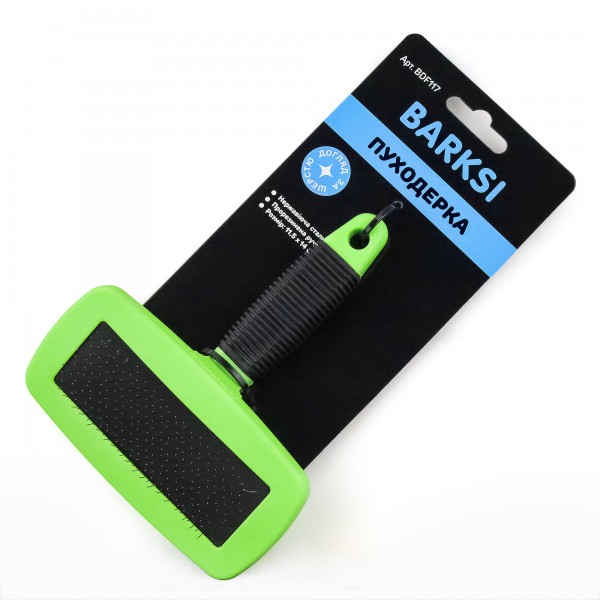 Щітка-пуходерка Barksi із прогумованою ручкою для догляду за шерстю та підшерстком домашніх тварин – професійний інструмент для ефективного та безпечного грумінгу вашого улюбленця. Виготовлена з міцного пластику й оснащена сталевими зубцями середнього розміру, дбайливо видаляє надлишки шерсті та підшерстка, не травмуючи шкіру тварини. Легка масажна дія зубців стимулює кровообіг, покращує стан шерсті та надає їй об’єму й здорового блиску.