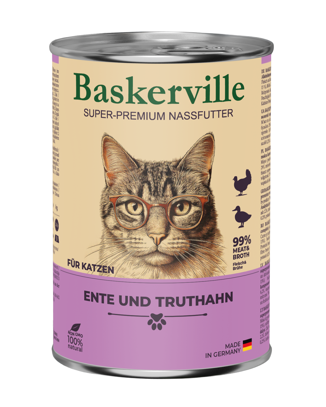 Консервований корм для котів Baskerville з качкою та індиком – це повноцінне збалансоване харчування для котів з нормальною активністю, створене для підтримки загального здоров’я, гарного самопочуття та енергійності тварини. Завдяки унікальній рецептурі та натуральним інгредієнтам корм забезпечує організм необхідними поживними речовинами, сприяє правильному обміну речовин, підтримує здорову шкіру та блискучу шерсть, а також допомагає забезпечити енергію для активного життя.