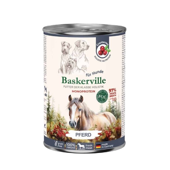 Консервований повнораціонний вологий корм класу холістик для собак Baskerville Monoprotein Pferd з кониною – це збалансований раціон преміальної якості, створений для підтримки здоров’я, енергії та гарного самопочуття собаки. Формула містить 97% м’ясних інгредієнтів – високоякісне м’ясо та поживний бульйон, які забезпечують організм необхідним білком і природними нутрієнтами для активного життя.
