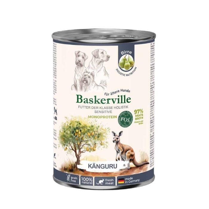 Консервований повнораціонний вологий корм класу холістик для собак із чутливим травленням і літніх собак Baskerville Monoprotein Känguru з м’ясом кенгуру – це спеціально розроблений раціон на основі одного джерела тваринного білка, який допомагає зменшити ризик алергічних реакцій та харчової непереносимості. Формула забезпечує делікатну підтримку травної системи, імунітету та загального стану організму.