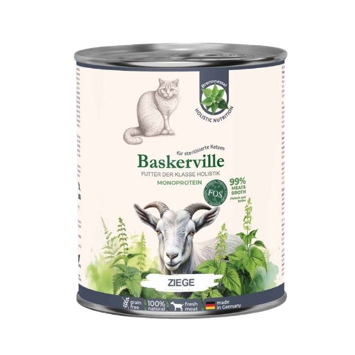Консервований повнораціонний корм класу холістик Baskerville Monoprotein Ziege з м’ясом кози для стерилізованих і малорухливих котів – це збалансоване харчування, створене з урахуванням особливих потреб тварин зі зниженою активністю та схильністю до набору ваги. Формула поєднує легкозасвоюване дієтичне м’ясо, функціональні рослинні компоненти та комплекс мінералів, що підтримують оптимальний обмін речовин і загальне здоров’я.