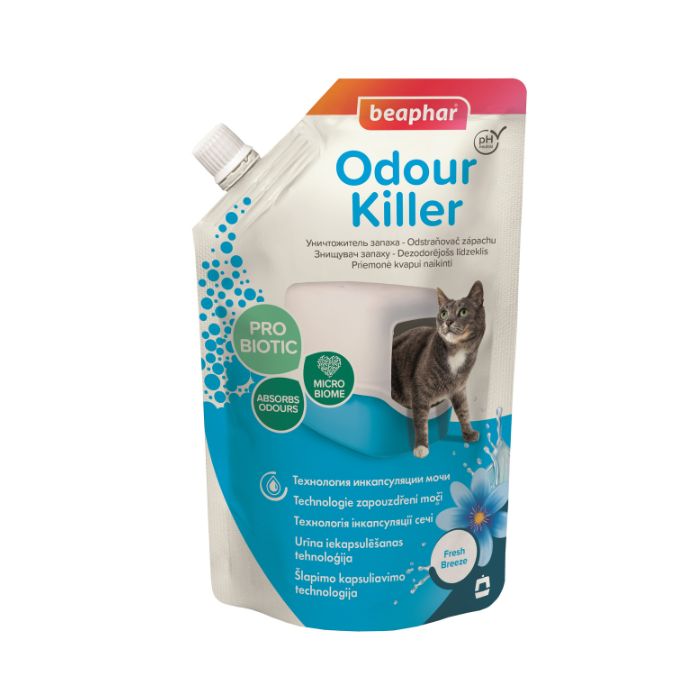 Дезодорант для котячого туалету Beaphar Odour Killer – інноваційний засіб для усунення неприємного запаху. На відміну від звичайних дезодорантів він не маскує запах, а повністю усуває його причину завдяки унікальній формулі з інгібітором ферментів та натуральними корисними бактеріями.