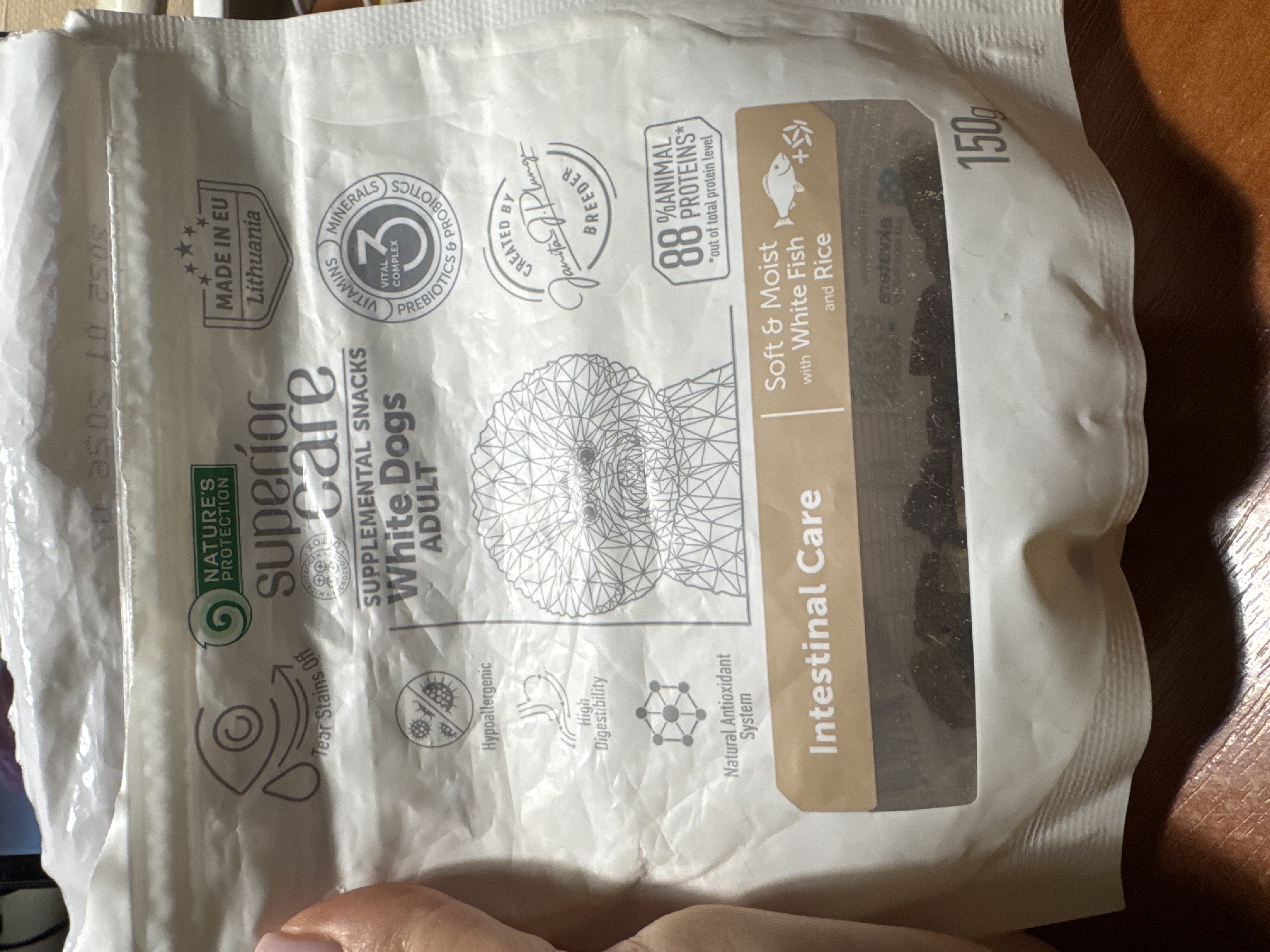 Ласощі сприяють підтримці загального самопочуття вихованця та поліпшенню роботи кишківника. Містять формулу Tear Stains off – ретельно підібраний комплекс амінокислот та повністю збалансовані інгредієнти у складі, які можуть допомогти у боротьбі з коричневими плямами від сліз навколо очей, рота, лап та інших частин тіла улюбленця. Джерелом білка є 1-й інгредієнт у складі.