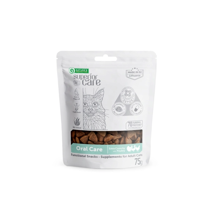 Ласощі Nature's Protection Superior Care Oral Care – це високоякісна добавка до корму, призначена для дорослих котів. Це ідеальний вибір, щоб проявити любов до вашого кота й водночас забезпечити його щоденною нормою необхідних вітамінів, мінералів та пребіотиків. Ці функціональні ласощі містять морські водорості, які допомагають підтримувати належну гігієну ротової порожнини вашого кота.