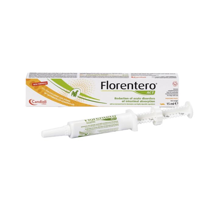 Дієтична добавка Florentero ACT якісно усуває діарею та підтримує правильну мікрофлору організму як під час гострої діареї, так і в період одужання. У складі добавки використано пробіотики та пребіотики виключно живих ексклюзивних штамів, що в цілому якісно усуває розлади кишечника, помітно покращує самопочуття улюбленця та сприяє зміцненню імунітету. Випускається у формі смачної пасти в зручному при використанні шприці-тюбику.