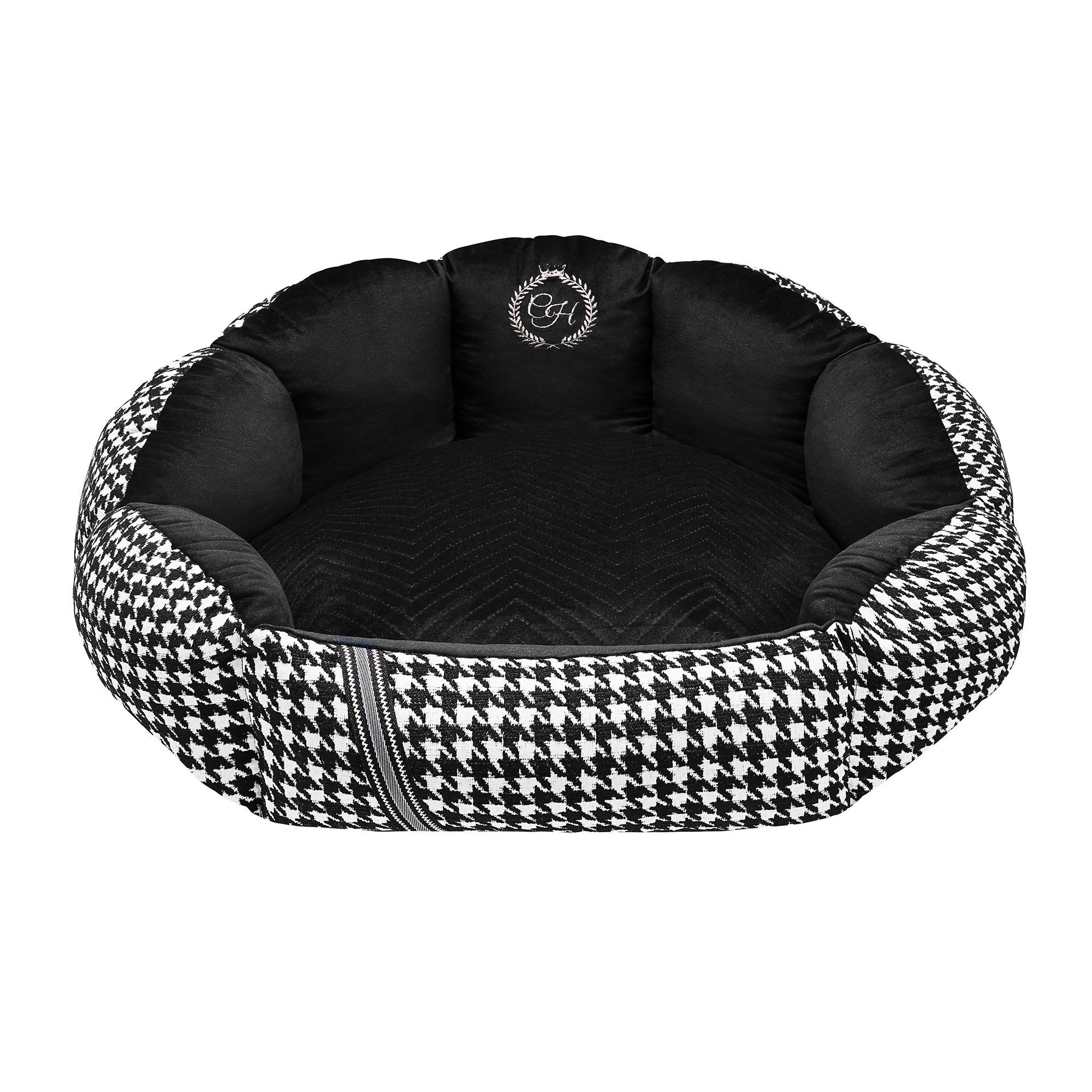 Щоб урізноманітнити дизайн, подушка оздоблена стьобаним матеріалом, а ззовні – перфорований плед із принтом «гусячі лапки», що створює ефект 3D. Спереду лежанка декорована елегантною стрічкою з додаванням шовку.