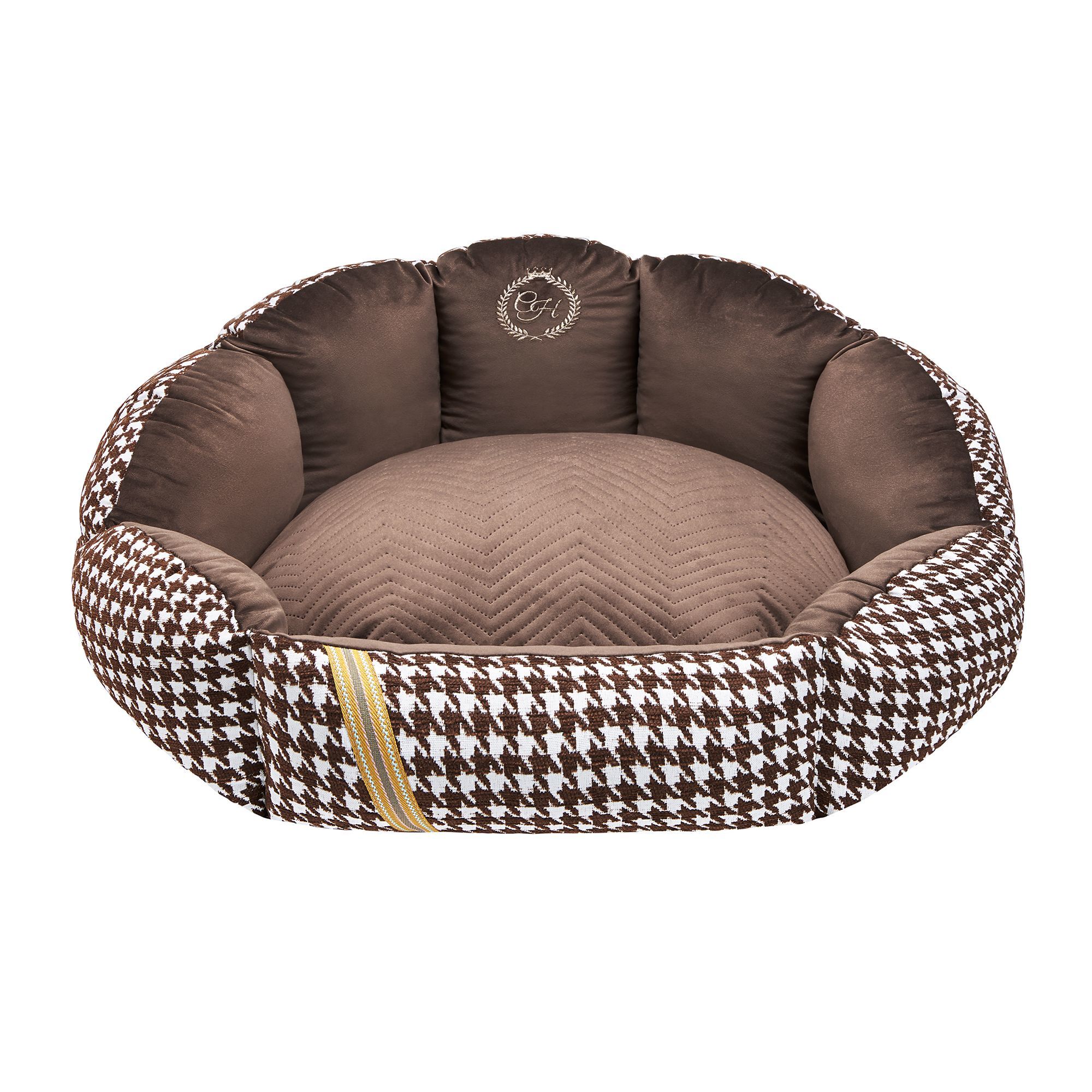 Щоб урізноманітнити дизайн, подушка оздоблена стьобаним матеріалом, а ззовні – перфорований плед із принтом «гусячі лапки», що створює ефект 3D. Спереду лежанка декорована елегантною стрічкою з додаванням шовку.