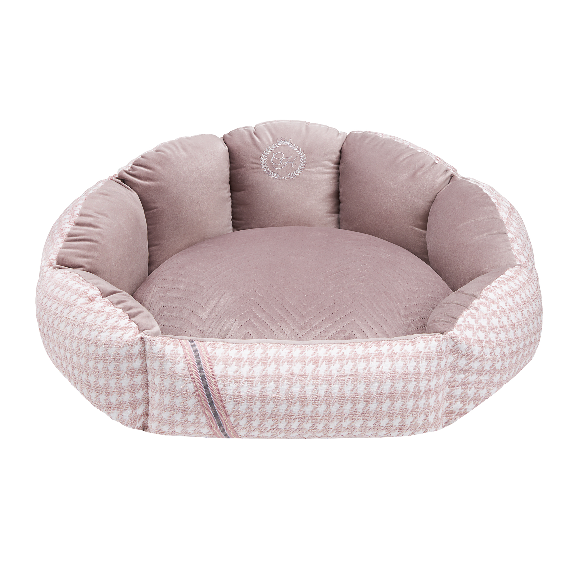 Щоб урізноманітнити дизайн, подушка оздоблена стьобаним матеріалом, а ззовні – перфорований плед із принтом «гусячі лапки», що створює ефект 3D. Спереду лежанка декорована елегантною стрічкою з додаванням шовку.