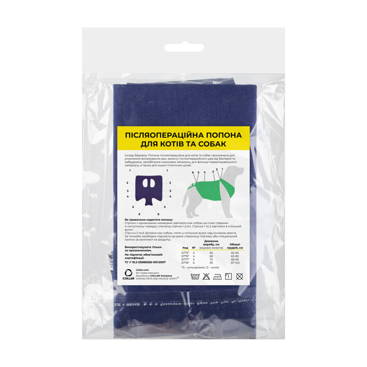 Післяопераційна попона Collar призначена для захисту тіла тварини після медичних операцій, для фіксації перев’язувального матеріалу, а також для підтримки гігієни та зручності у період відновлення. Виготовлена з легкого та міцного матеріалу, попона забезпечує комфорт і не обмежує рухів тварини. Ефективно запобігає доступу до швів, ран і післяопераційних зон, що знижує ризик інфікування та допомагає уникнути подразнення шкіри, потрапляння забруднень і бактерій, запобіганню запалень і надійної фіксації перев’язувального матеріалу.