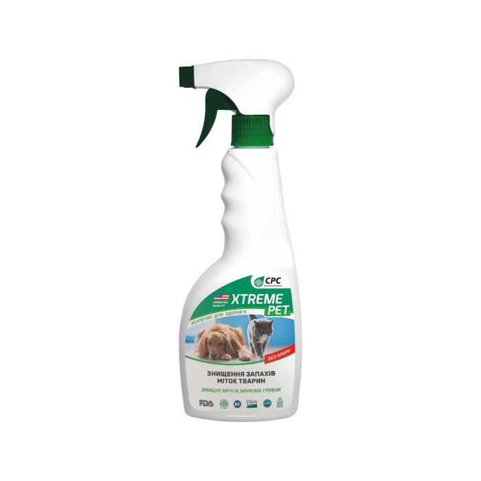 Дезінфікуючий та дезодоруючий засіб CPC Xtreme Pet виготовлений на основі пробіотичних бактерій і призначений для усунення неприємних запахів, слідів міток тварин, сечі. Засіб ефективний для швидкого усунення запахів на твердих і м’яких поверхнях. Застосовується в місцях утримання домашніх тварин, ветеринарних клініках і зоомагазинах.