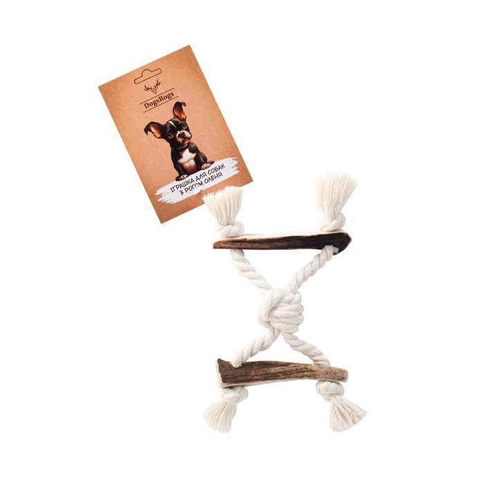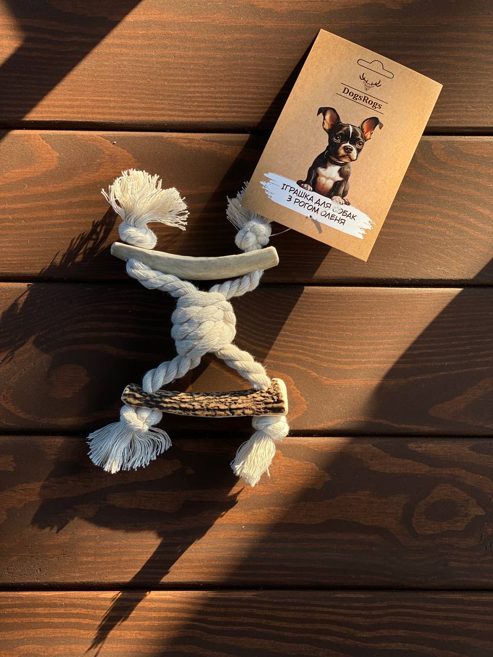 Натуральна жувальна іграшка для собак, виготовлена з оленячого рогу та бавовняного канату, стане улюбленою забавкою для вашого улюбленця. Це екологічні та безпечні вироби, що займуть собаку на тривалий час і не лише втішать цікавим заняттям, а й користю.