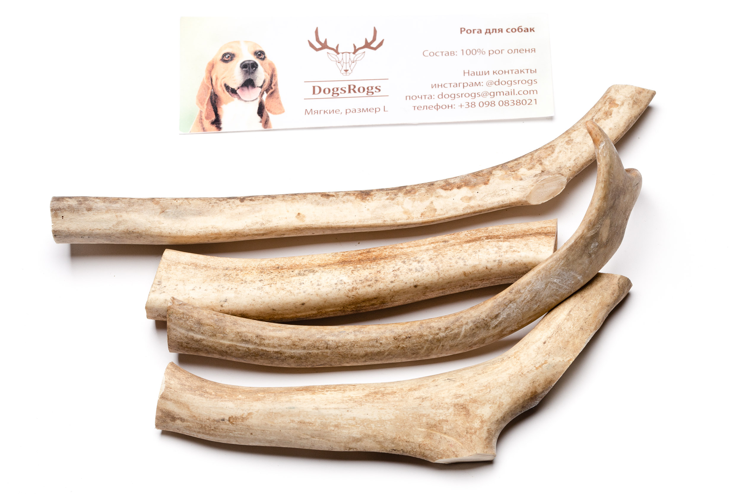 - М’які оленячі роги з розміром 30 см підходять улюбленцям середніх порід, з вагою від 15 до 35 кг – із низьким рівнем гризучості, або для менших собак із середнім рівнем гризучості;