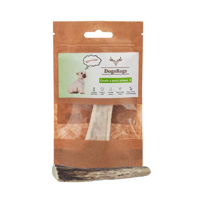 - Спліт з рогу оленя середньої твердості з розміром 10 см підходить маленьким собакам вагою до 5 кг, з низьким та середнім рівнями гризучості, або цуценятам великих порід зі схожими особливостями;