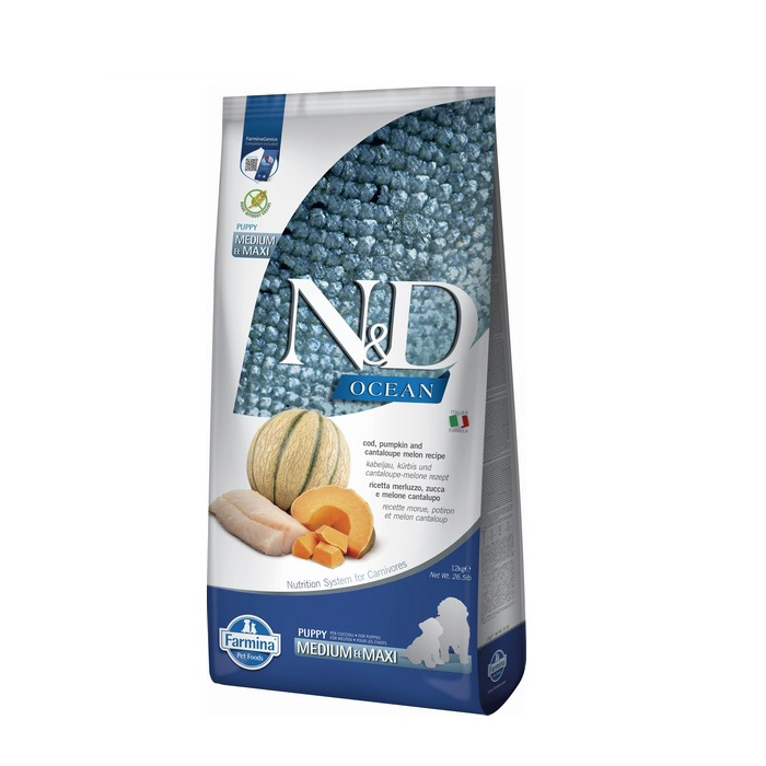 Повнораціонний сухий корм для цуценят із тріскою, гарбузом і динею Farmina N&D Ocean Puppy Medium & Maxi Cod, Pumpkin & Cantaloupe Melon підходить вихованцям середніх і великих порід від 2 до 16 місяців.