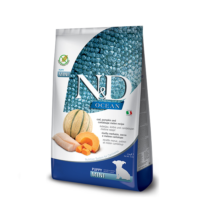 Повнораціонний сухий корм для цуценят із тріскою, гарбузом і динею Farmina N&D Ocean Puppy Mini Cod, Pumpkin & Cantaloupe Melon підходить вихованцям дрібних порід до 12 місяців.