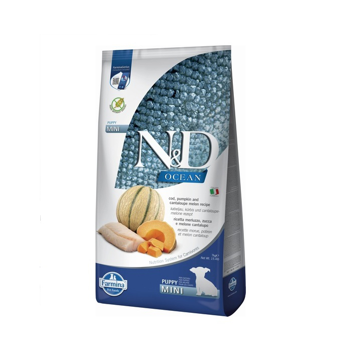 Повнораціонний сухий корм для цуценят із тріскою, гарбузом і динею Farmina N&D Ocean Puppy Mini Cod, Pumpkin & Cantaloupe Melon підходить вихованцям дрібних порід до 12 місяців.