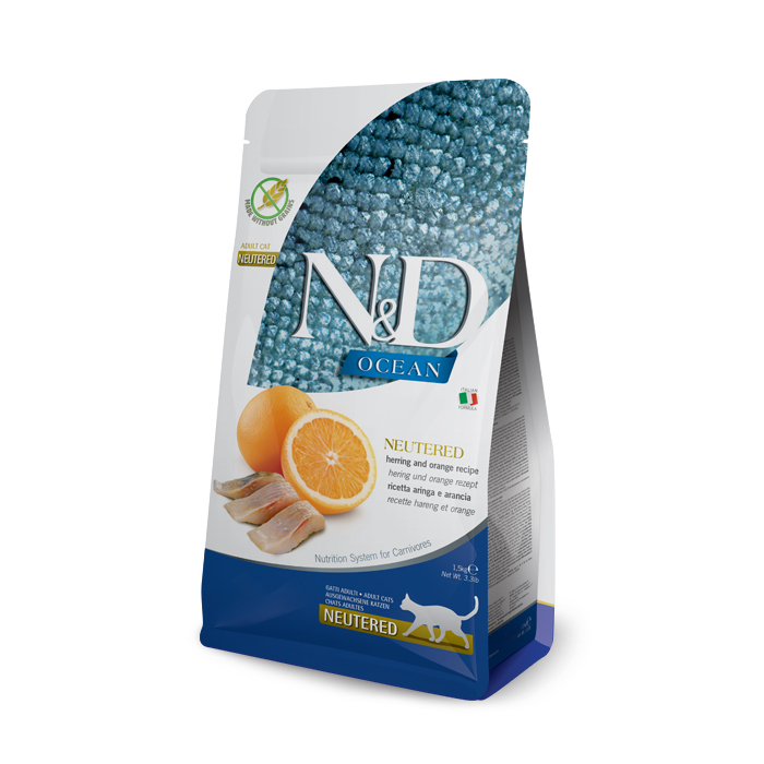 Сухий корм для дорослих котів із оселедцем і апельсином Farmina N&D Ocean Cat Adult Neutered (Sterilised) Herring & Orange підходить улюбленцям після стерилізації.