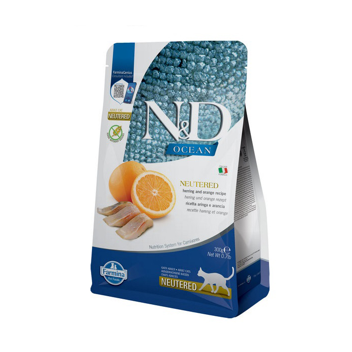 Сухий корм для дорослих котів із оселедцем і апельсином Farmina N&D Ocean Cat Adult Neutered (Sterilised) Herring & Orange підходить улюбленцям після стерилізації.