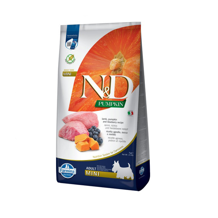 Повнораціонний сухий корм для дорослих собак дрібних порід із ягнятиною, гарбузом і чорницею Farmina N&D Pumpkin Grain Free Dog Adult Mini Lamb & Blueberry не містить зернових і забезпечує улюбленця необхідним балансом вітамінів і мінералів.