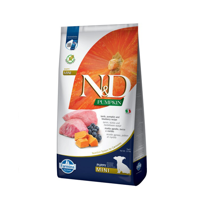 Повнораціонний сухий корм для цуценят із ягнятиною, гарбузом і чорницею Farmina N&D Pumpkin Grain Free Puppy Mini Lamb & Blueberry створений для вихованців дрібних порід, а також підходить вагітним і годуючим собакам.