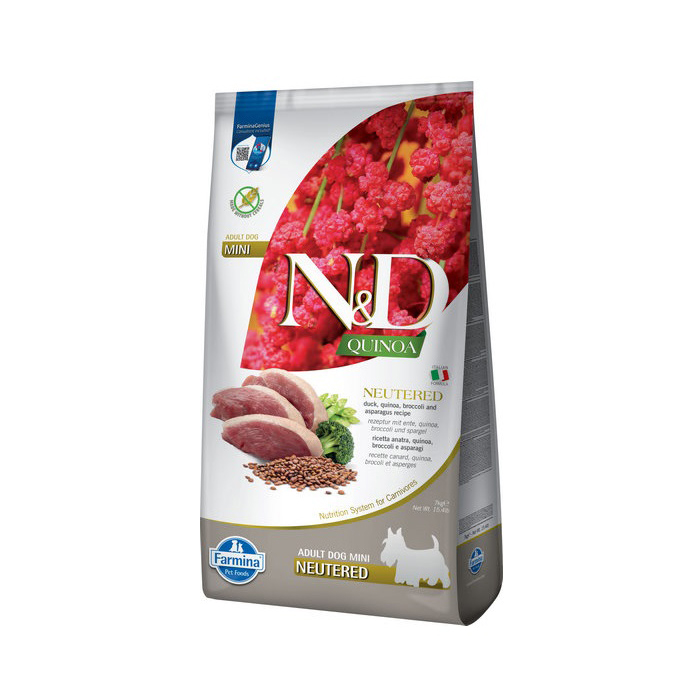Повнораціонний сухий корм із качкою, броколі та спаржею для дорослих собак дрібних порід Farmina N&D Quinoa Dog Adult Mini Neutered Duck, Broccoli & Asparagus підходить улюбленцям після стерилізації.