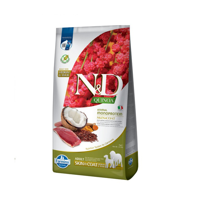 Повнораціонний сухий корм із качкою, кіноа та кокосом для дорослих собак середніх і великих порід Farmina N&D Quinoa Dog Adult Medium & Maxi Skin & Coat Duck & Coconut допомагає підтримувати здоров’я шкіри та шерсті улюбленця.