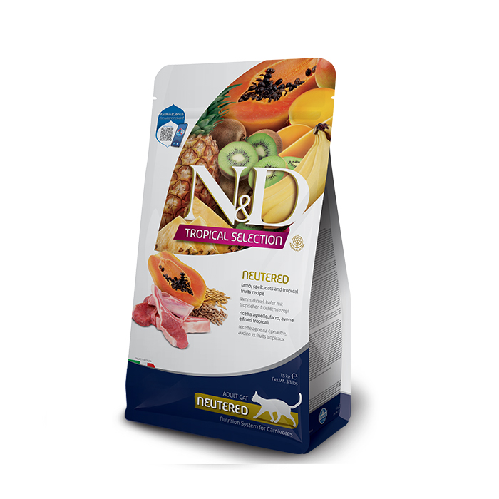 Сухий корм для дорослих котів із ягнятиною, спельтою та фруктами Farmina N&D Tropical Selection Cat Adult Neutered (Sterilised) Lamb, Spelt, Oats & Fruits підходить улюбленцям після стерилізації та забезпечує ідеальний баланс вітамінів і мінералів для підтримки здоров’я та активності.