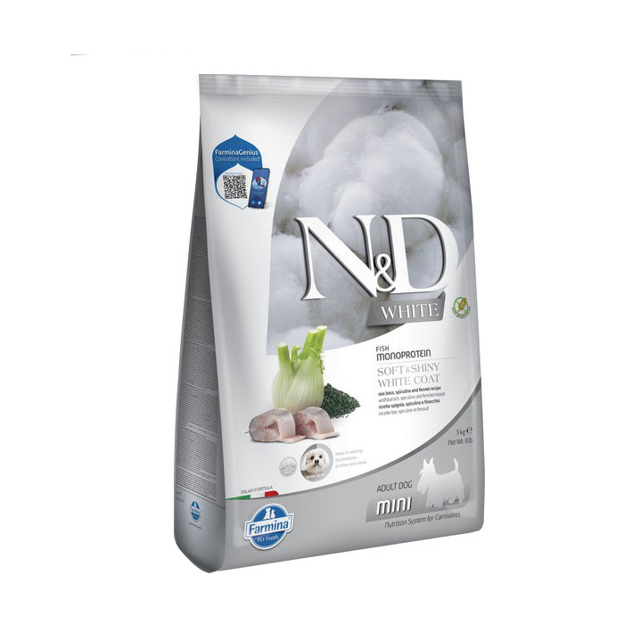 Повнораціонний сухий корм для дорослих собак дрібних порід із морським окунем, спіруліною та фенхелем Farmina N&D White Dog Adult Mini Sea Bass, Spirulina & Fennel підходить улюбленцям із білим або світлим забарвленням шерсті.