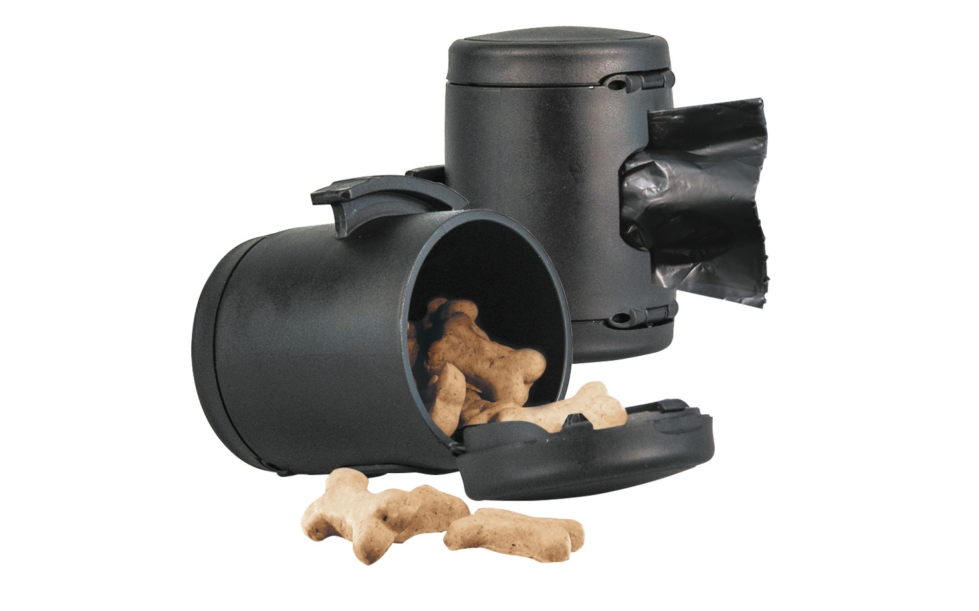 - У контейнер можна помістити рулон із пакетами для прибирання за твариною або улюблені ласощі вашого вихованця, щоб підбадьорювати його під час прогулянки за виконання команд або знизити стрес