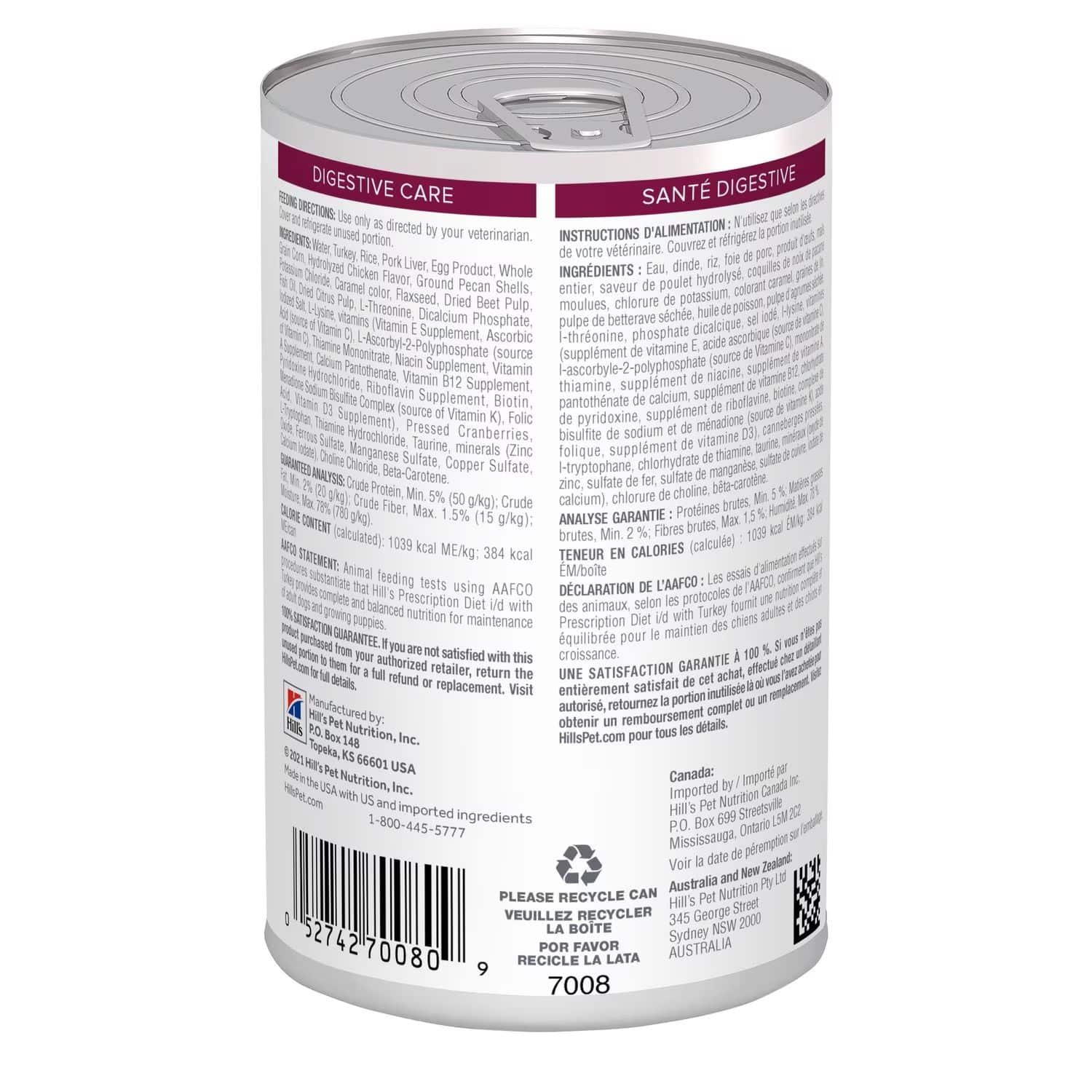 Hill's Prescription Diet i/d Dog Food with Turkey – повнораціонний дієтичний корм для домашніх тварин із високою засвоюваністю, призначений для зменшення кишкових розладів всмоктування, компенсації порушення травлення та екзокринної недостатності підшлункової залози у собак. Цей корм має підвищений рівень натрію і калію та інгредієнти, які добре засвоюються.