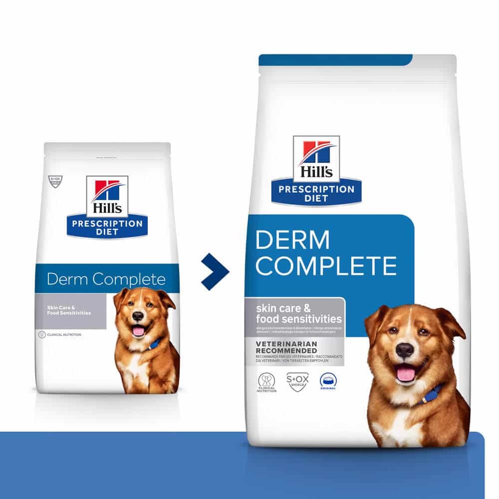 Сухий корм Hill’s PRESCRIPTION DIET Derm Complete – це повнораціонне дієтичне харчування для собак, спеціально розроблене дієтологами та ветеринарними лікарями. Раціон має клінічно доведену ефективність у полегшенні симптомів захворювань шкіри незалежно від їхньої першопричини.