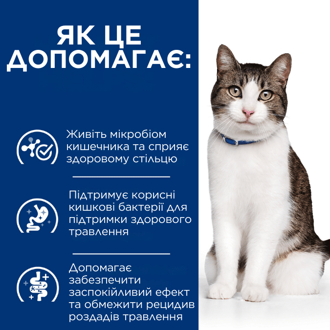 На здоров'я травної системи вашої кішки можуть негативно впливати багато факторів, і коли у вашої кішки розлад травлення, це абсолютно неприємний досвід для всіх учасників. Ви можете допомогти своїй кішці почуватися краще за допомогою корму, який революціонізує підхід до проблем шлунково-кишкового тракту, чутливих до клітковини, ставлячи здоров'я мікробіома – унікальну екосистему кишківника вашого улюбленця – на передній план догляду за шлунково-кишковим трактом.