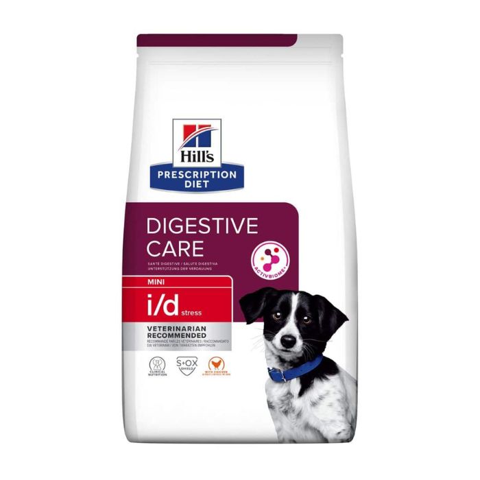 Сухий корм Hill’s PRESCRIPTION DIET i/d Stress Mini, з курятиною – лікувальне повнораціонне харчування для дорослих собак малих порід (до 14 кг), спеціально розроблене для підтримки травлення при стресі, ентеропатії та інших порушеннях кишкового всмоктування. Раціон легко засвоюється, допомагає нормалізувати випорожнення та підтримує здоров’я кишкового мікробіома.