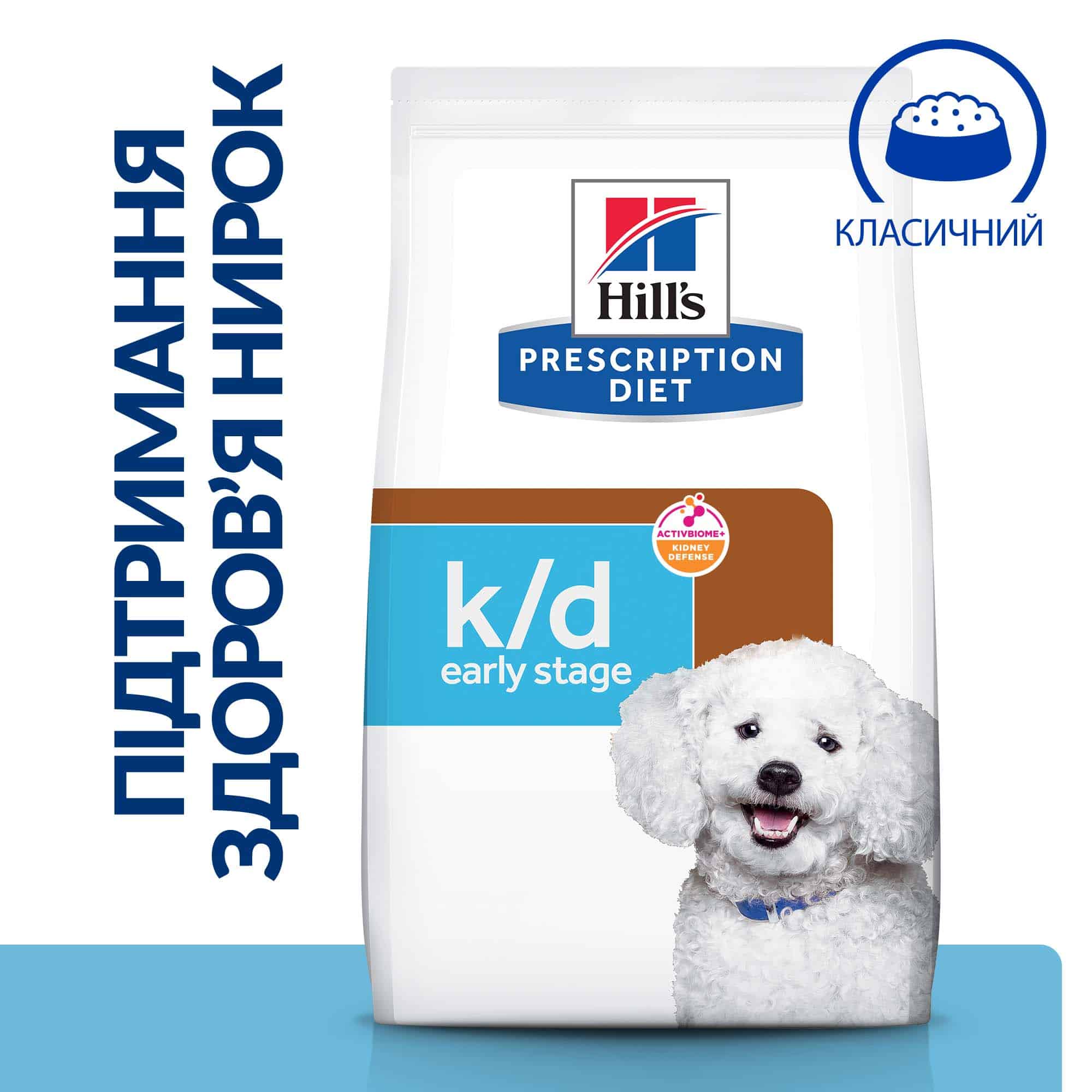 Сухий лікувальний корм з куркою для собак Hill's Prescription Diet k/d Kidney Care Early Stage – повнораціонне дієтичне харчування для собак із захворюваннями нирок, спеціально розроблене для зниження навантаження на нирки та підтримання їх ефективної роботи на ранніх стадіях хвороби.
