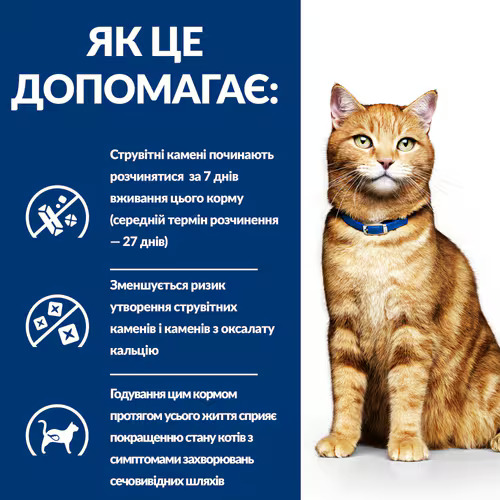 • Спеціальна формула починає розчиняти струвітні камені всього за 7 днів споживання корму (середній термін розчинення складає 27 днів).