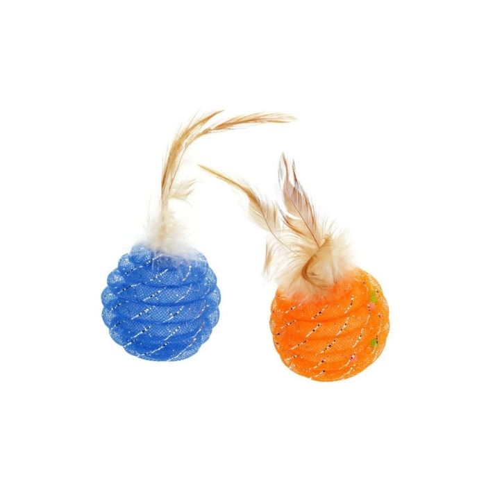 Іграшка має потішний дизайн, тому точно сподобається вашому улюбленцю. М’ячики з яскравої сітки з поліестеру, декоровані пір’їнками, одразу привернуть увагу улюбленця.