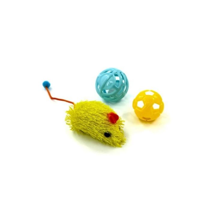 HIPPIE PET Набір іграшок для котів Мишка та два м'ячика, жовтий і синій 3 шт