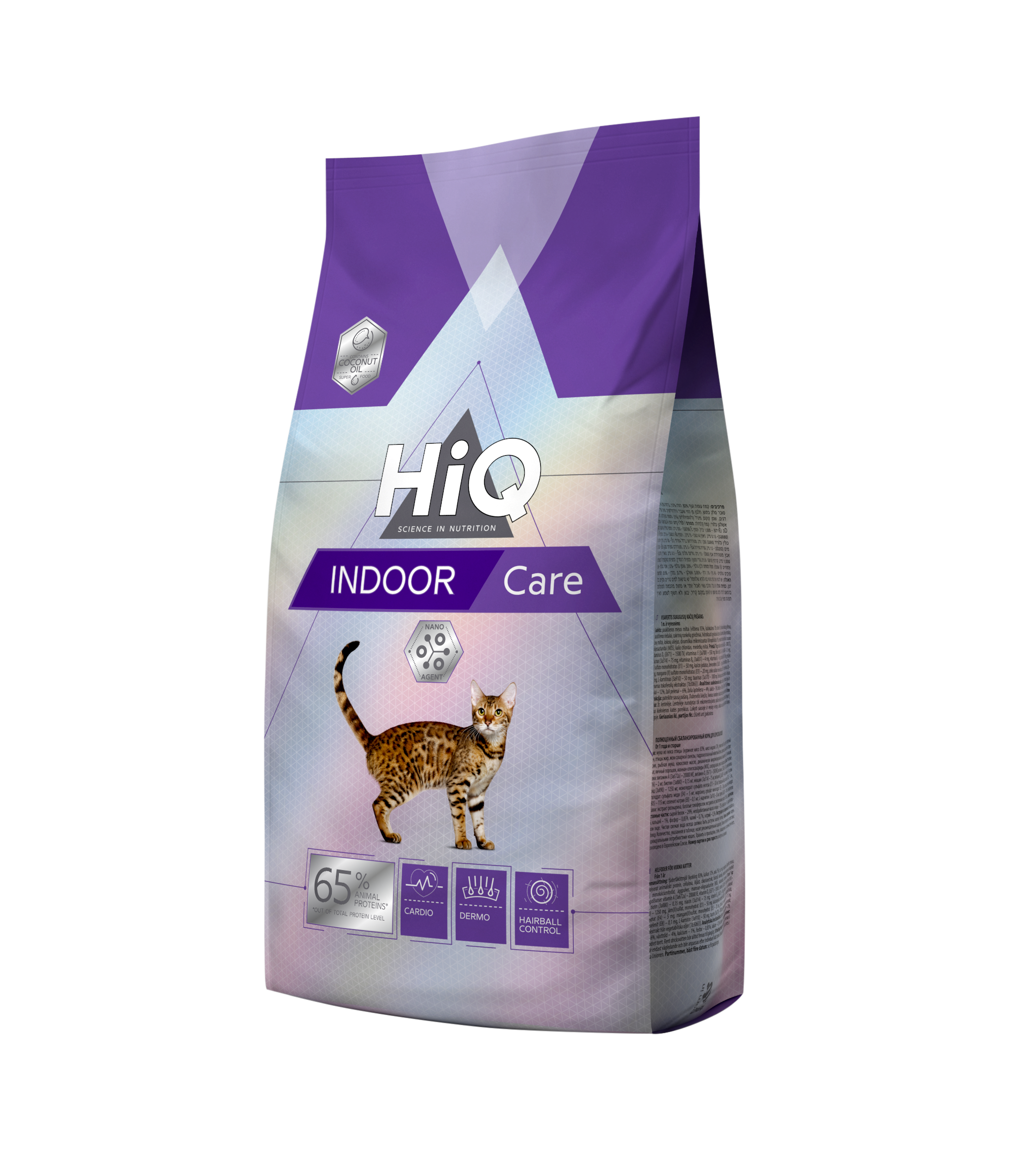 „HiQ Indoor Care“ – сухий корм Супер-преміум класу для дорослих котів (від 1 року та старше). Спеціалізований корм підвищує засвоюваність поживних речовин, полегшує роботу травної системи, а також покращує стан шкіри та підтримує густоту шерсті домашнього вихованця.