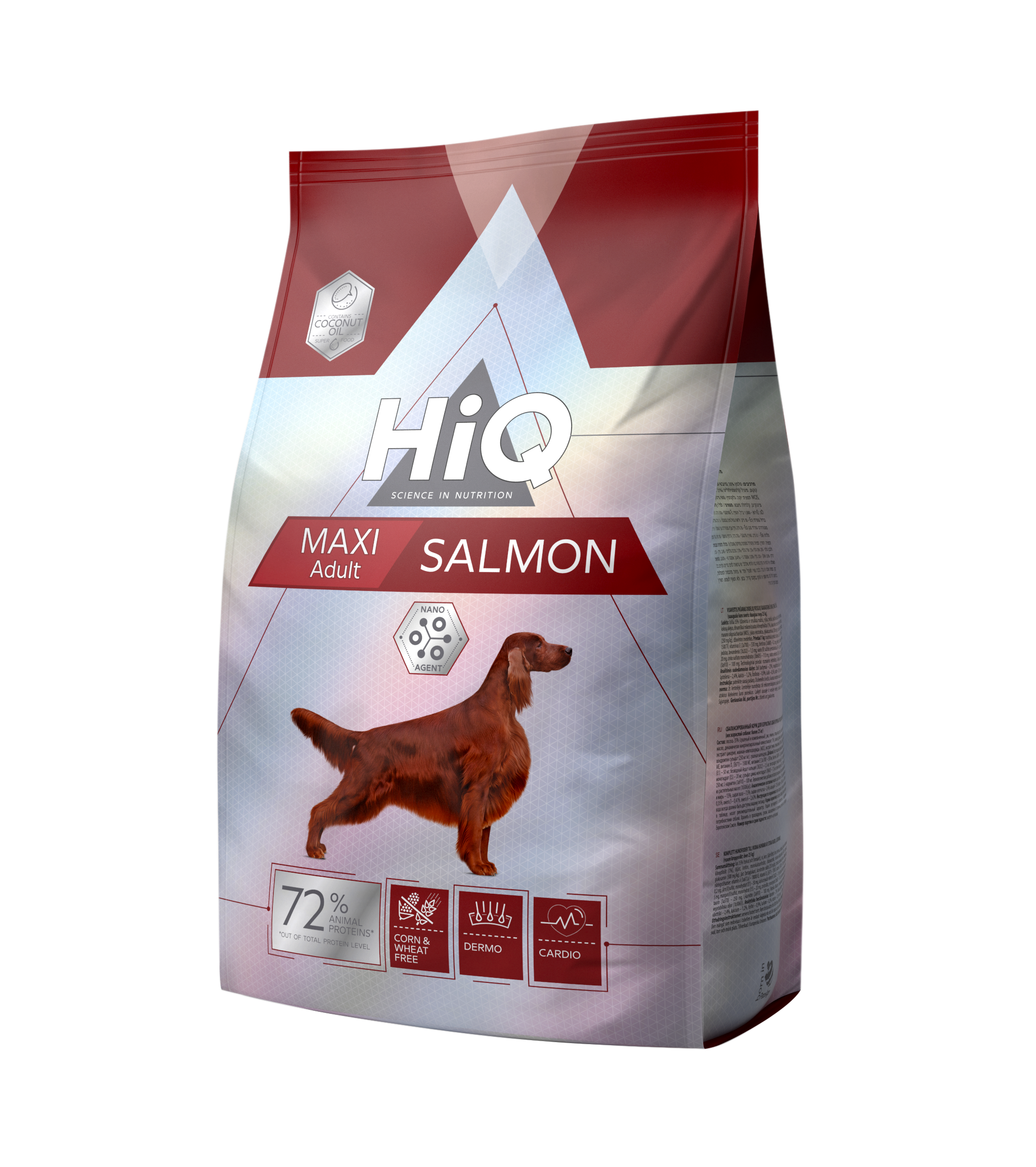„HiQ Maxi Adult Salmon“ – сухий корм Супер-преміум класу для дорослих собак великих порід (від 25 кг) із лососем. Продукт сприяє зміцненню серцево-судинної системи домашньої тварини.