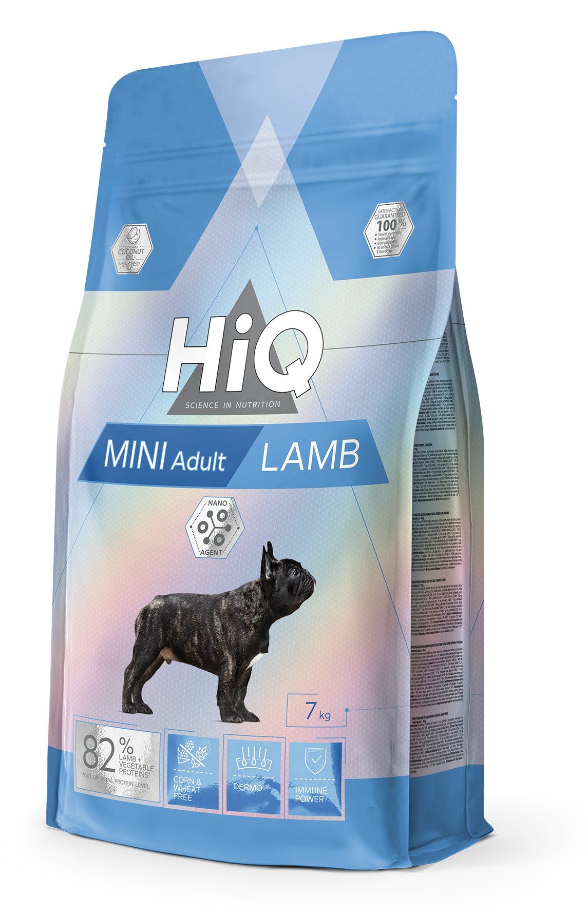 „HiQ Mini Adult Lamb“ – повнораціонний сухий корм Супер-преміум класу з ягнятиною для дорослих собак малих порід (вага дорослої тварини 1-10 кг). Ретельно підібране поєднання активних речовин сприяє енергійності, здоров'ю та тривалості життя домашнього вихованця.