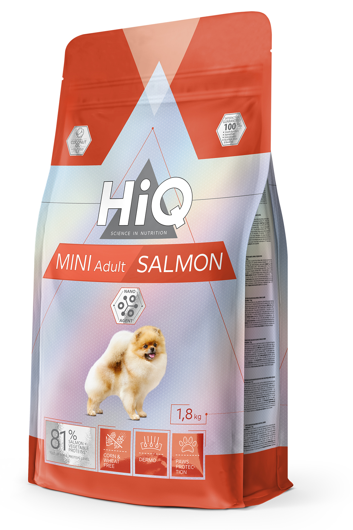 „HiQ Mini Adult Salmon“ – сухий корм Супер-преміум класу для дорослих собак малих порід, з лососем (вага дорослої тварини 1-10 кг). Легкозасвоюваний корм оптимально підходить для собак із чутливою системою травлення або схильністю до харчової алергії.