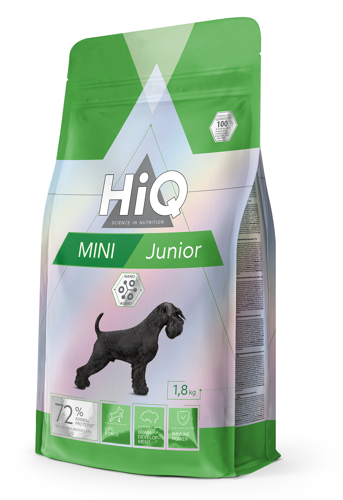 „HiQ Mini Junior“ – сухий корм Супер-преміум класу для цуценят та молодих собак (від 2 до 12 міс.) малих порід. Повнораціонний легкозасвоюваний корм допомагає підтримати здорове зростання та розвиток, а також зміцнити імунну систему молодого вихованця.