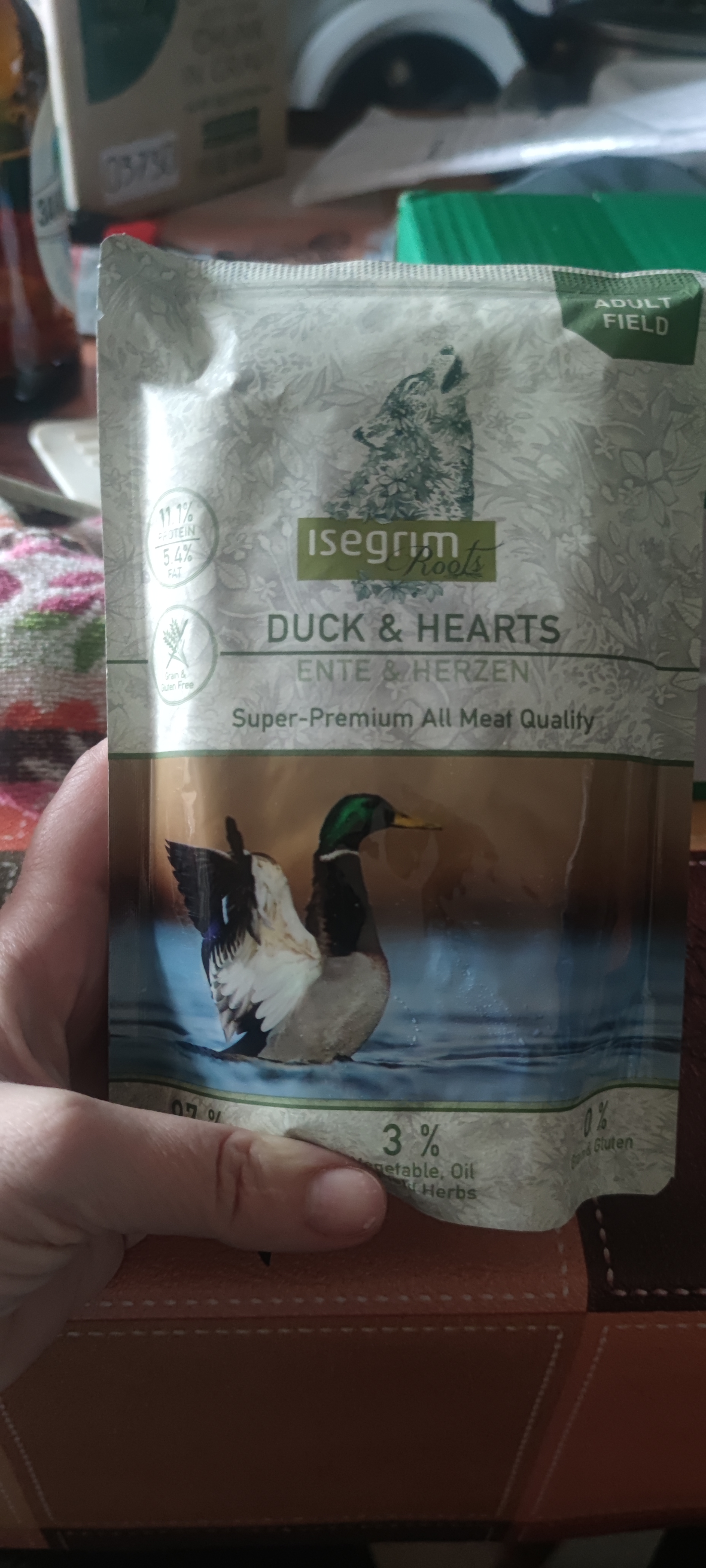 Вологий корм у паучі Isegrim Pouch Roots Duck & Hearts із качкою, курячими сердечками, овочами, лляною олією та травами – це повноцінний вологий корм для дорослих собак усіх порід, створений для щоденного годування з урахуванням природних потреб хижака. Формула базується на високій частці тваринних інгредієнтів і поєднує качине м’ясо та курячі сердечка, забезпечуючи оптимальний баланс білків та жирів для підтримки енергії, м’язового тонусу та загального фізичного стану собаки. Корм не містить злаків і підходить улюбленцям із чутливою травною системою.
