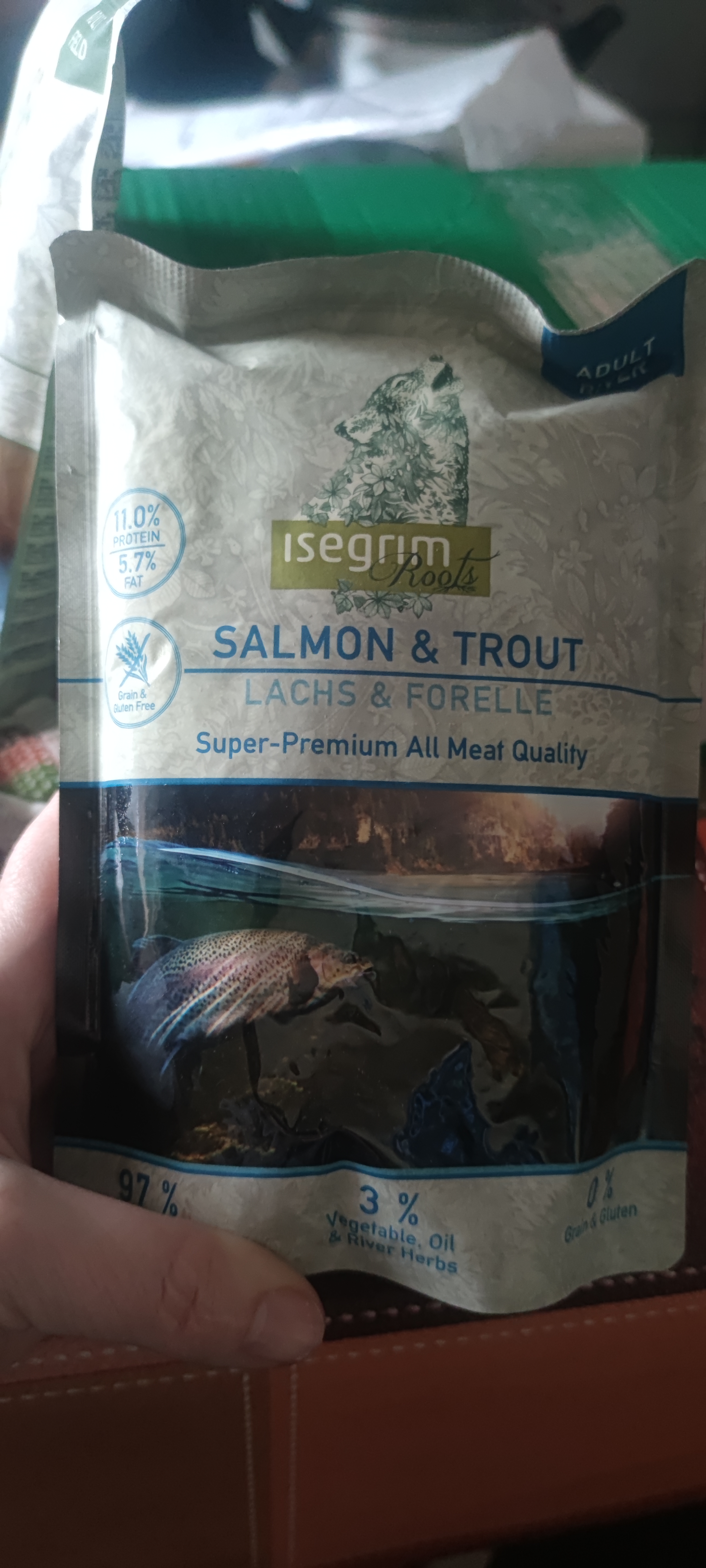 Вологий корм ISEGRIM Pouch Roots Salmon & Trout із лососем, фореллю, курятиною, топінамбуром, сафлоровою олією та травами – це повноцінний вологий корм для дорослих собак, створений для щоденного раціону з урахуванням природних потреб хижака. Формула базується на високій частці тваринних інгредієнтів і не містить злаків, тому підходить улюбленцям із чутливим травленням або схильністю до харчових реакцій. Поєднання лосося та форелі забезпечує організм необхідними жирними кислотами Омега‑3, що підтримують здоров’я шкіри, блиск шерсті та роботу серцево‑судинної системи, а пісна курятина доповнює раціон високоякісним білком для підтримки м’язового тонусу та загальної енергії.